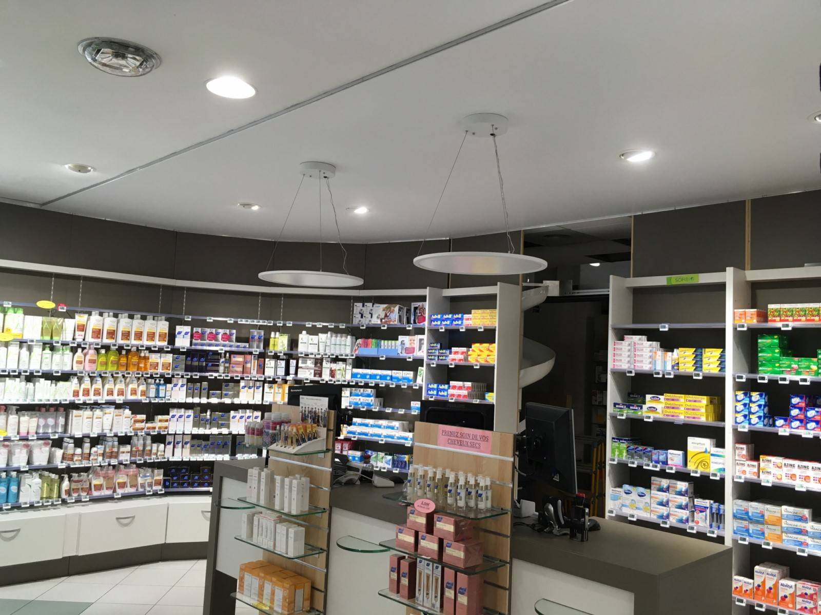 Quant à la partie éclairage, cela a pu être adapté à la nouvelle utilisation de cet espace rénové en déplaçant et multipliant les points lumineux. En bref, tout le monde était ravi de la mise en valeur de la pharmacie, même si le satiné blanc se confond avec l'aspect classique du placo-plâtre.