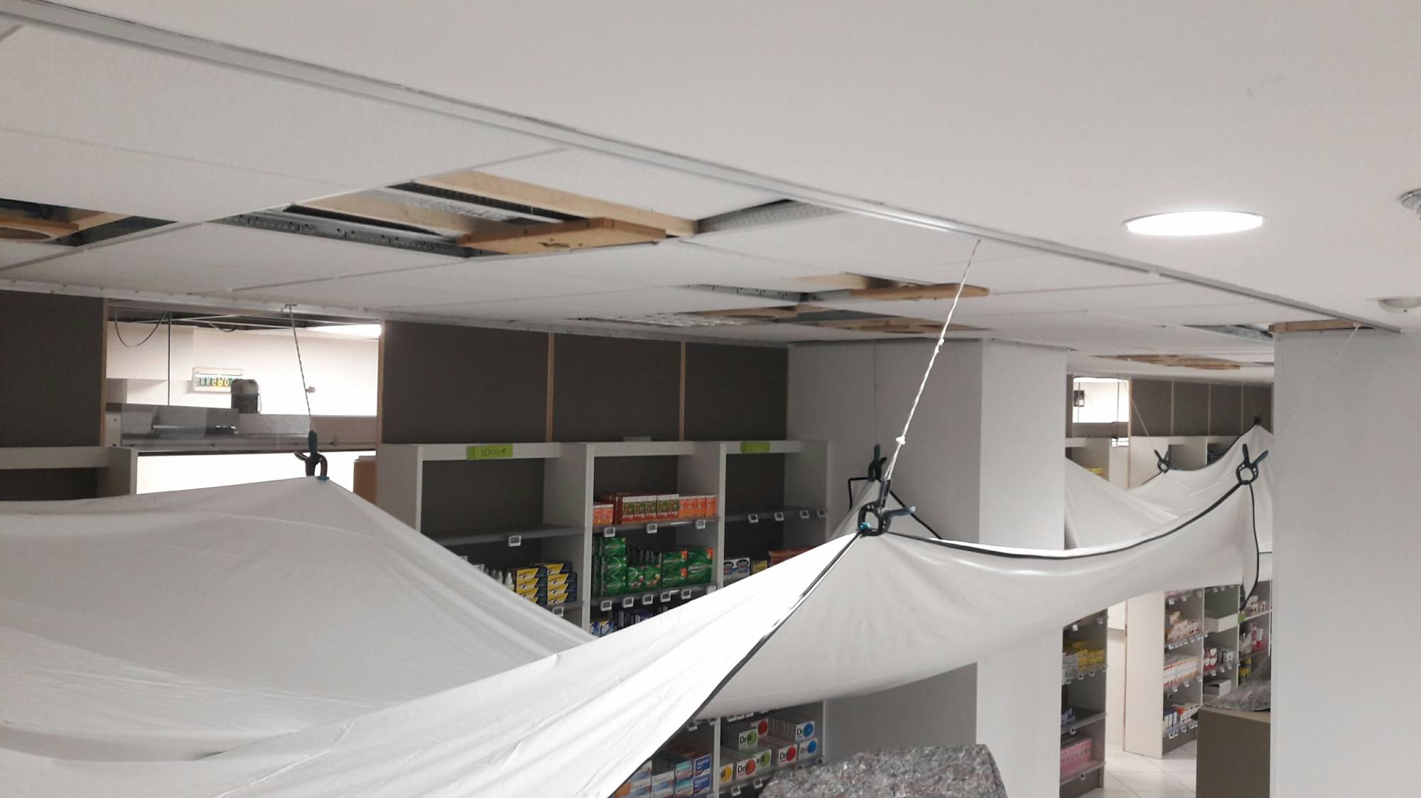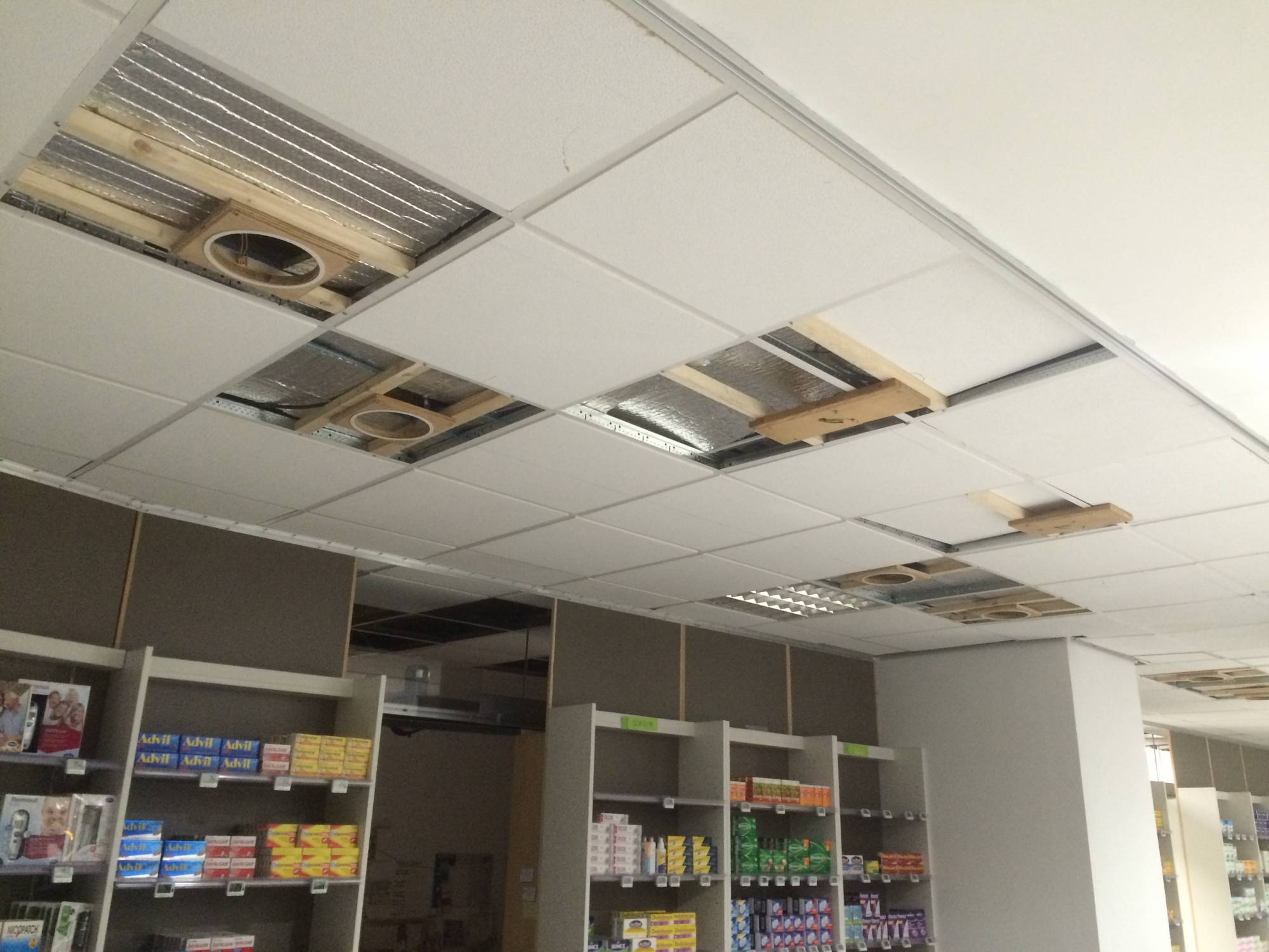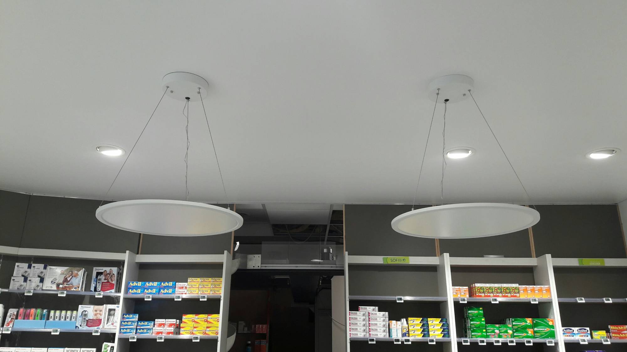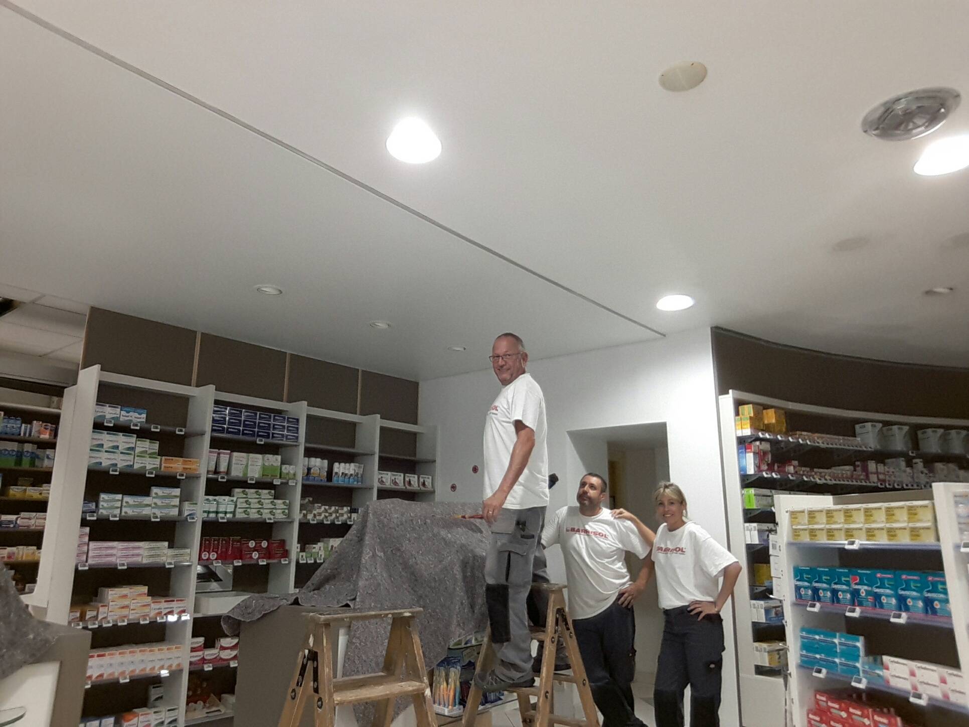 En attendant de reprendre notre activité sur le chantier du cinéma de Ramonville, l'équipe complète de Plafonds Tendus Occitans est intervenue à la pharmacie de Samatan pour la pose d’un plafond tendu BARRISOL satiné blanc, dans le nouvel espace rénové.
