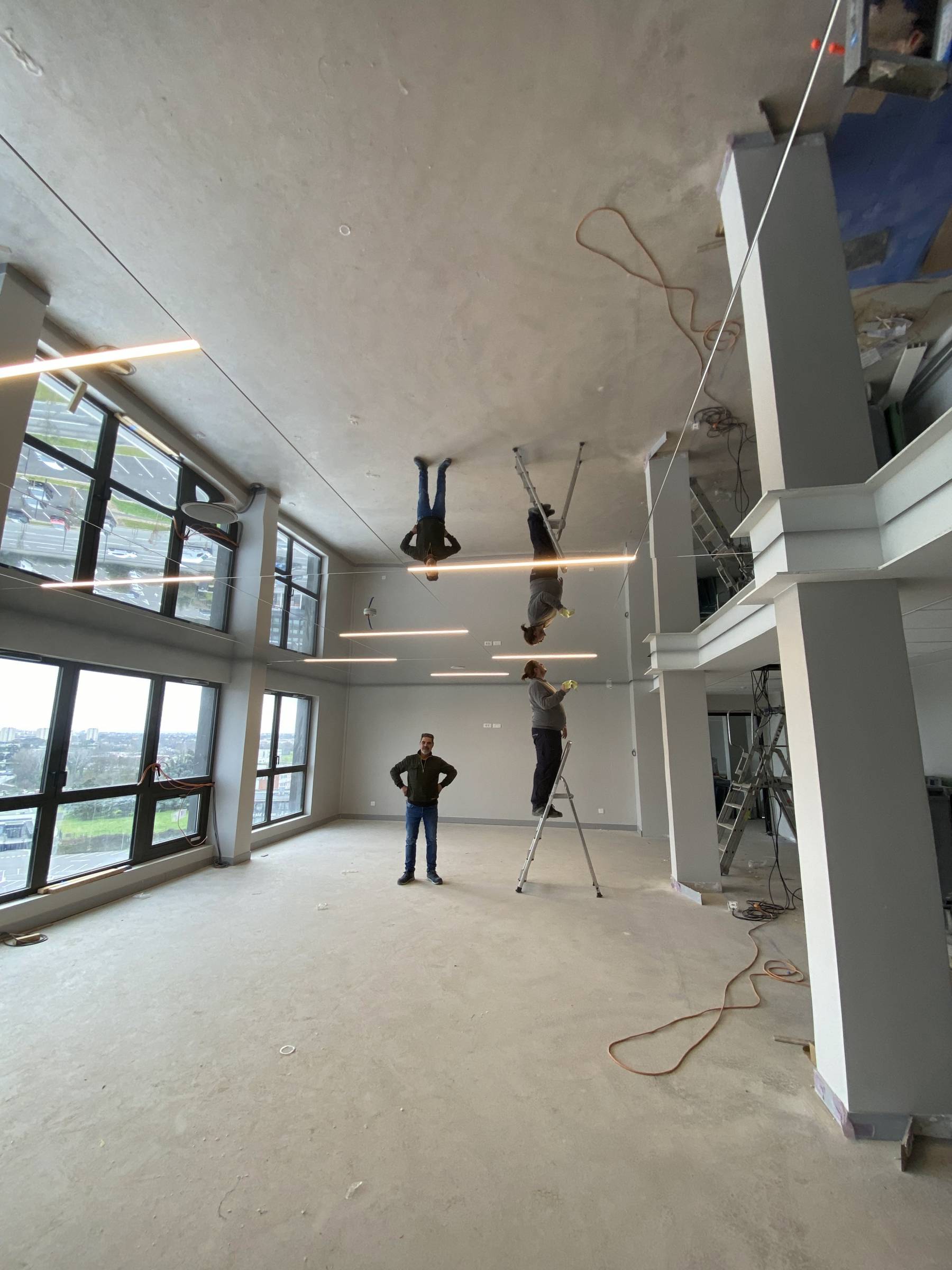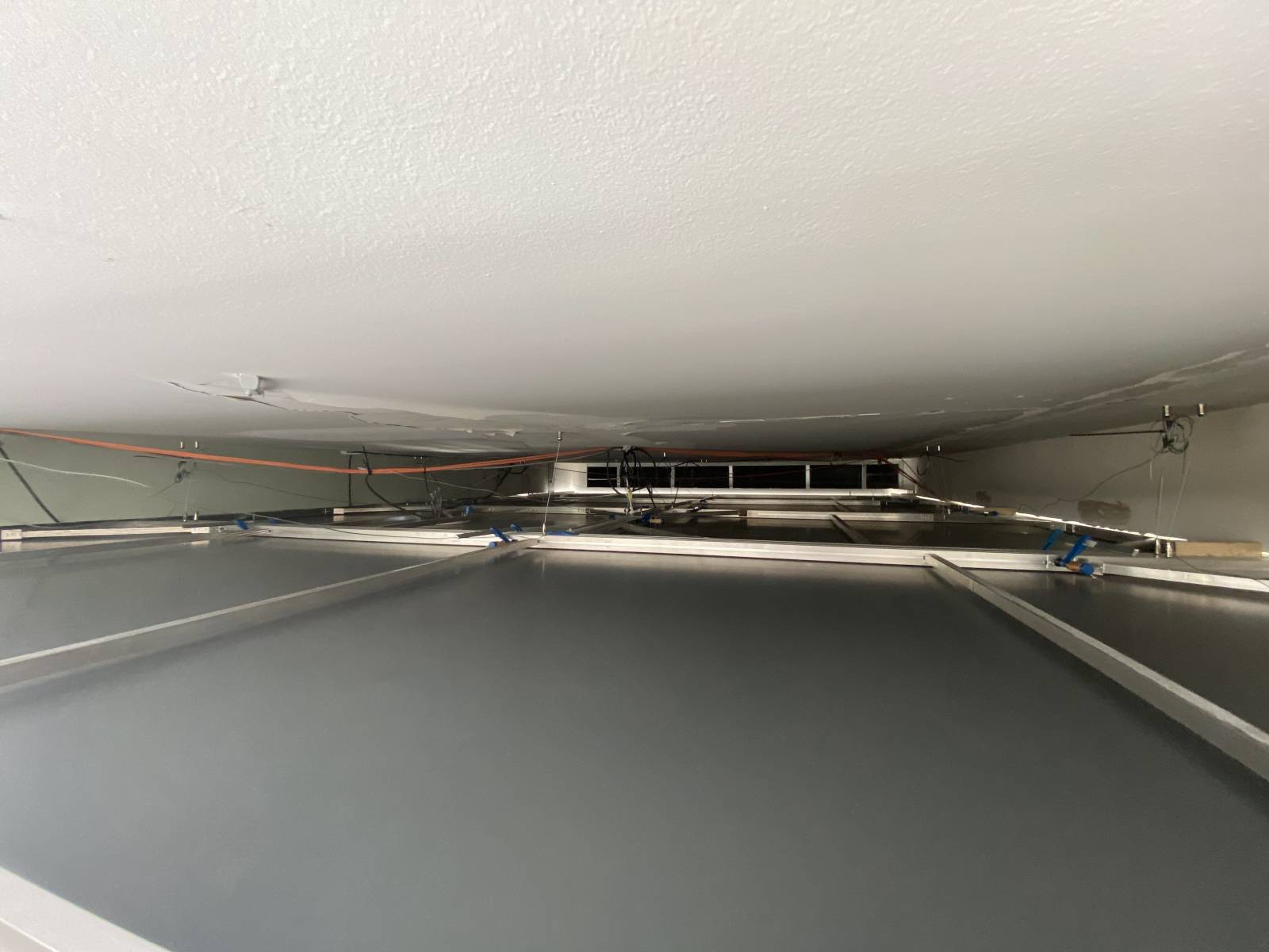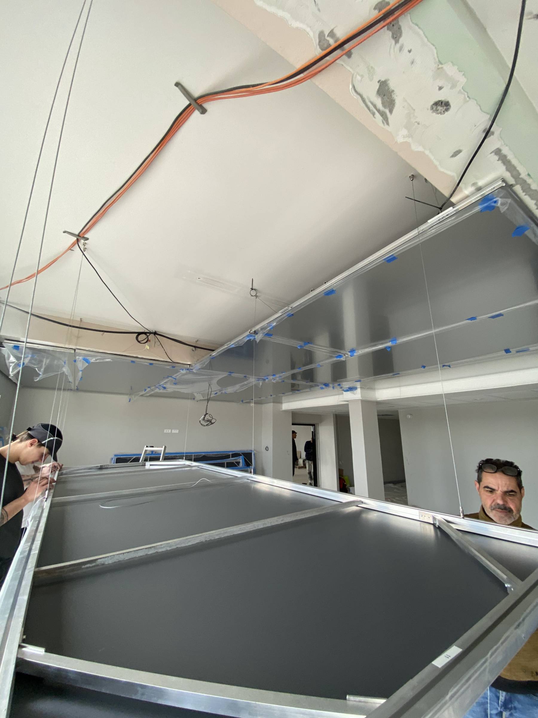 C'était une première, pour nous, de réaliser l'installation de ces plafonds tendus dont l'effet miroir est vraiment bluffant. Contrairement à la mise en œuvre d'une toile tendue "classique", ce type de produit ne peut être proposé qu'à des dimensions spéciales et limitées. En effet, le lé de toile PVC miroir argenté ne peut être soudé à un autre lé, contrairement aux autres plafonds tendus de type mat, satiné ou laqué. Ce lé est donc directement fixé sur un cadre métallique, lui-même suspendu par des filins au plafond initial.
