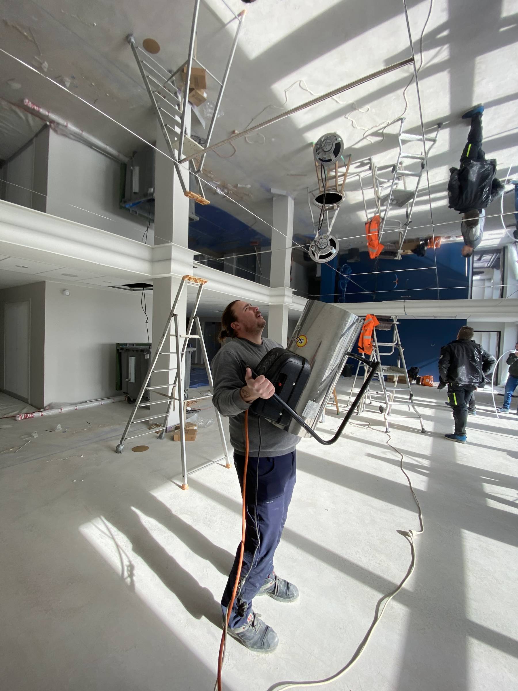 Une fois les 18 cadres mis en place pour couvrir la surface totale de la pièce, la pellicule de protection est retirée des toiles. Intervient, alors, une petite mise en chauffe qui permet de révéler l'effet miroir escompté.