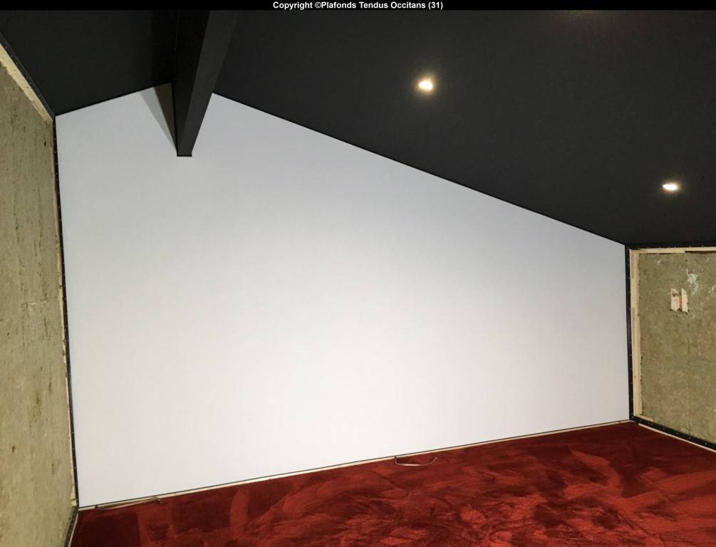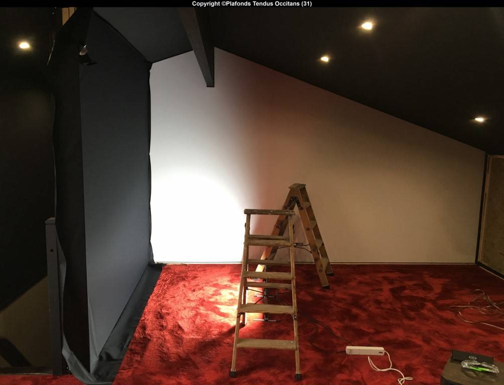 Ces toiles tendues (blanche et noires) habillent les murs pour une finition parfaite avec un écran géant et une ambiance feutrée, sans écho.