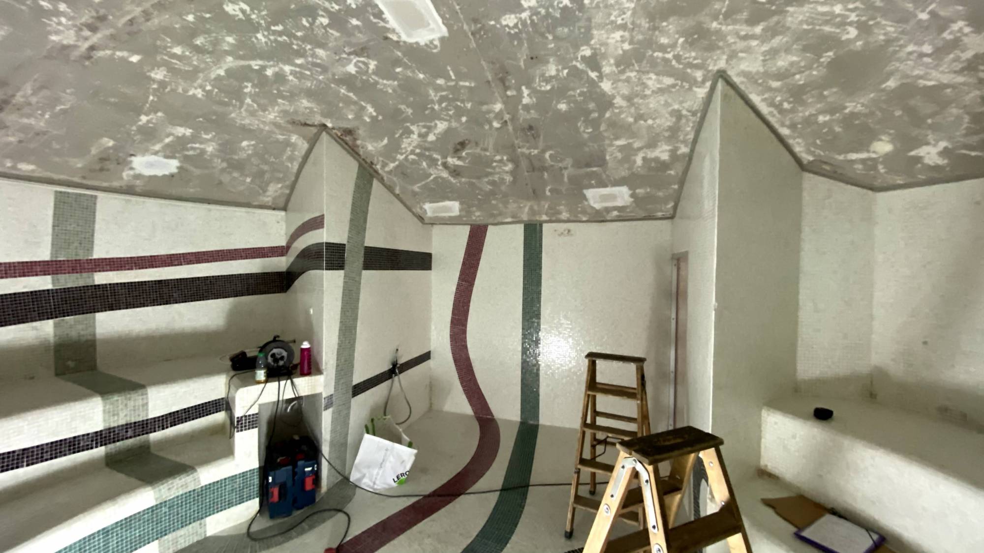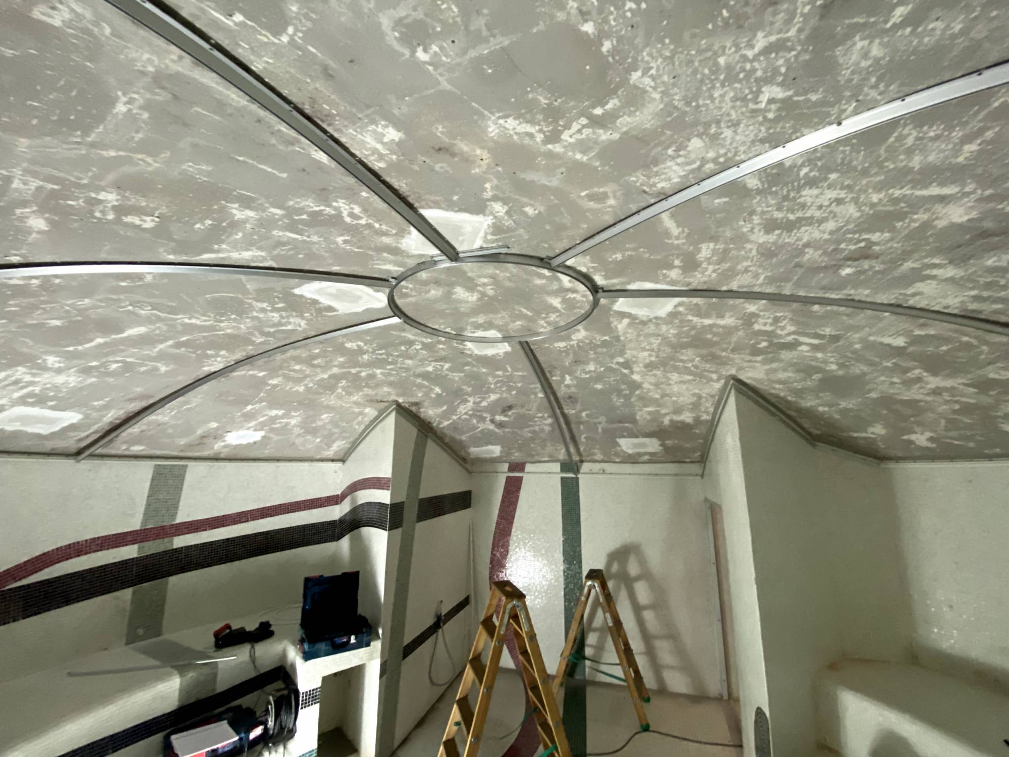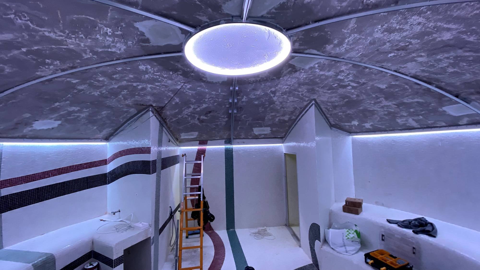Il s'agit d'un hammam en forme de voûte dont le plafond brut a été habillé de plusieurs toiles tendues BARRISOL, fixées sur des rails en ALU.