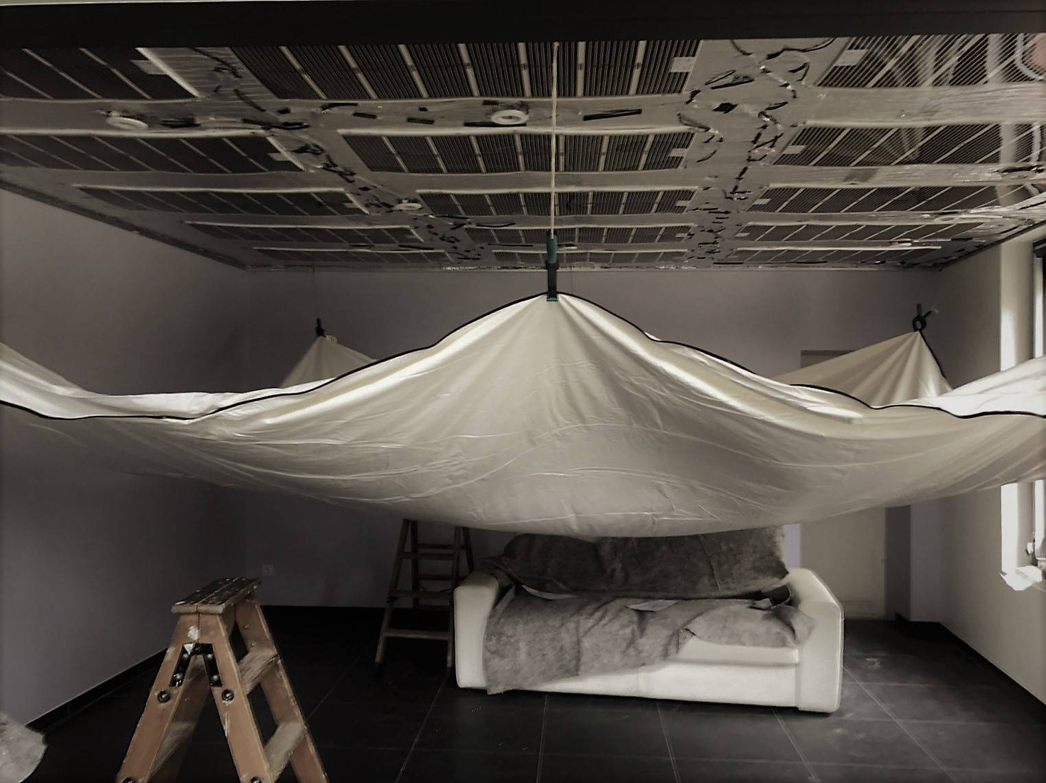 Le plafond et les murs du plénum (espace libre entre le plafond initial et le plafond tendu) sont habillés avec cet isolant mince permettant l’étanchéité à l’air. Tel un double vitrage, l’air piégé dans ce plénum devient un redoutable isolant.