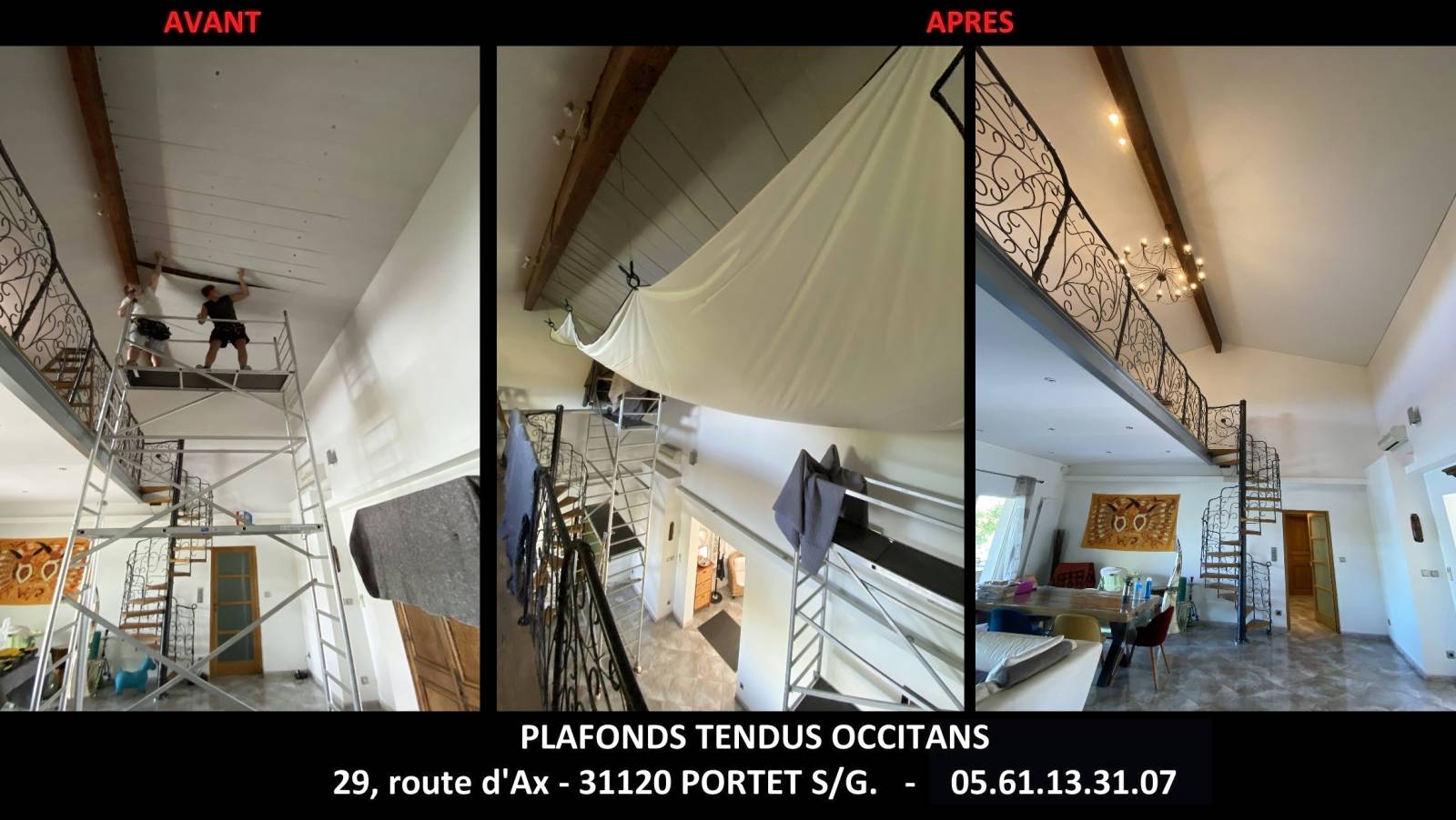 - plafonds tendus en 2 volumes avec consolidation du lambris PVC qui s'est partiellement décroché (sinistre tempête). La hauteur sous plafond importante n'est pas un frein à notre intervention.