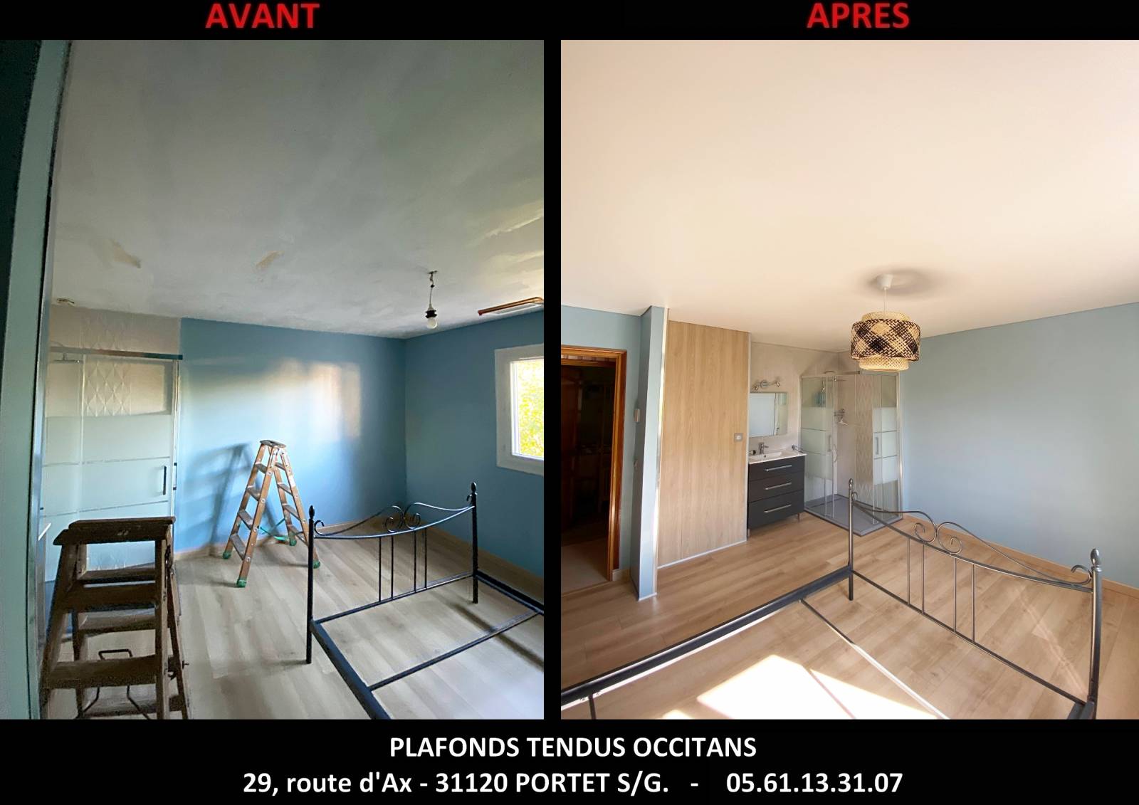 - plafond tendu mat blanc dans une chambre pour finaliser complètement la rénovation réalisée.