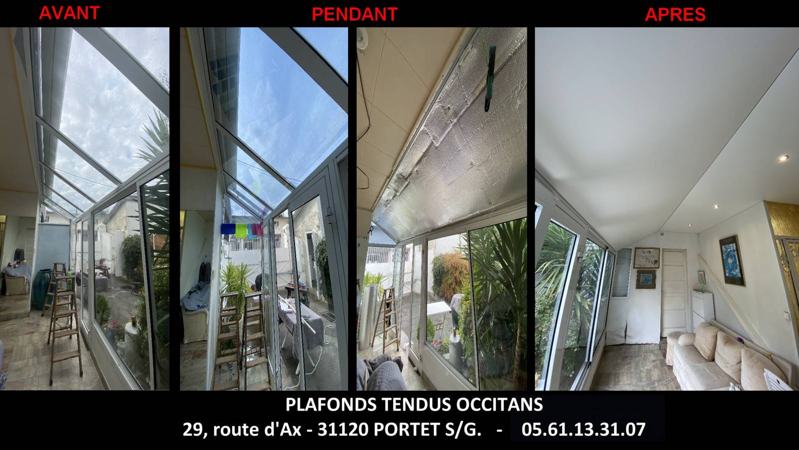 - plafonds tendus dans une véranda en 2 volumes avec pose d'un film anti-uv sur la partie vitrée ainsi que d'un isolant mince pour améliorer le confort thermique en toutes saisons.