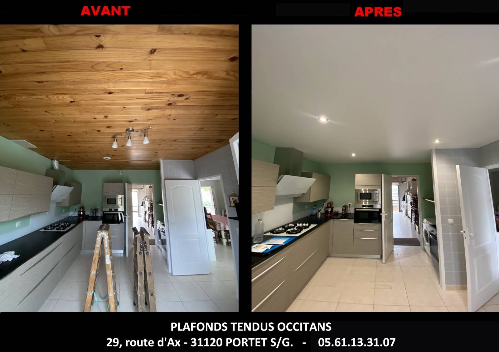 - Même si le lambris bois a eu ces heures de gloire, désormais cela ne convient plus à une décoration contemporaine. Le plafond tendu blanc mat modifie radicalement l'aspect de cette cuisine en apportant clarté et modernité.