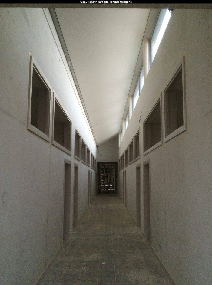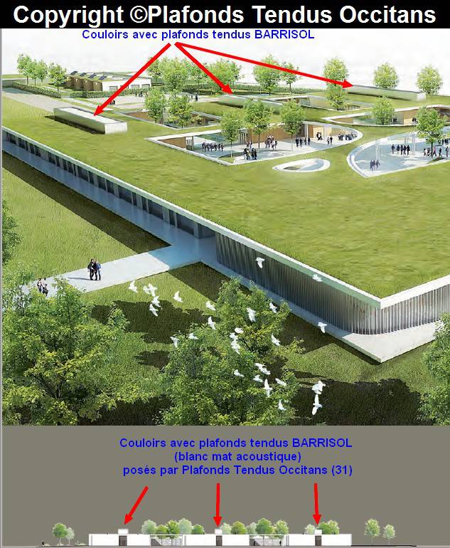 Techniquement, afin d'améliorer le confort sonore de ces couloirs, l'architecte a préconisé la pose d'un absorbeur acoustique et de plafonds tendus acoustiques BARRISOL (blanc mat micro-perforé acoustiques A15).