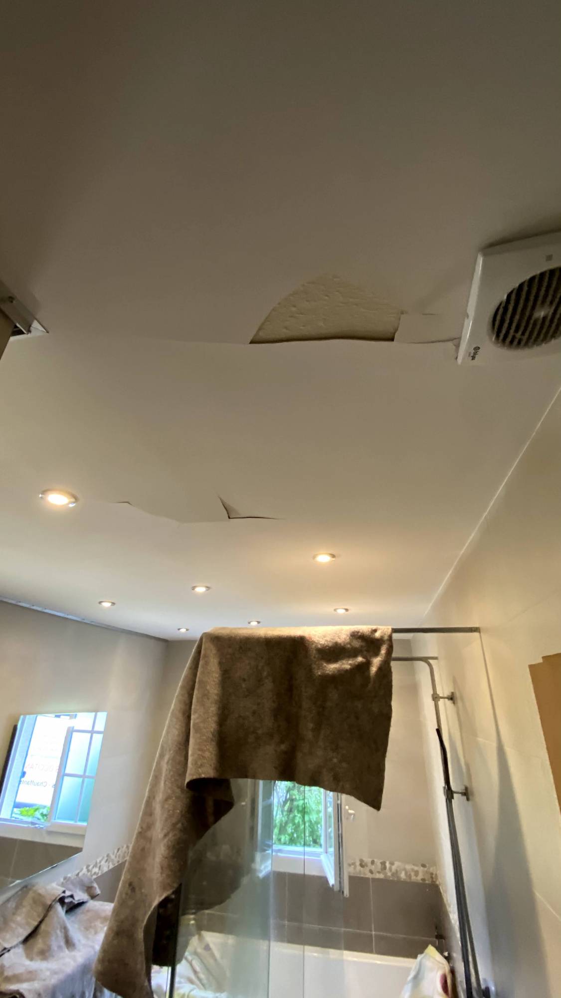 Intervient, ensuite, le moment de la mise en chauffe de la toile, de son accrochage et des percements pour le passage des spots et de la bouche de VMC à travers la toile.