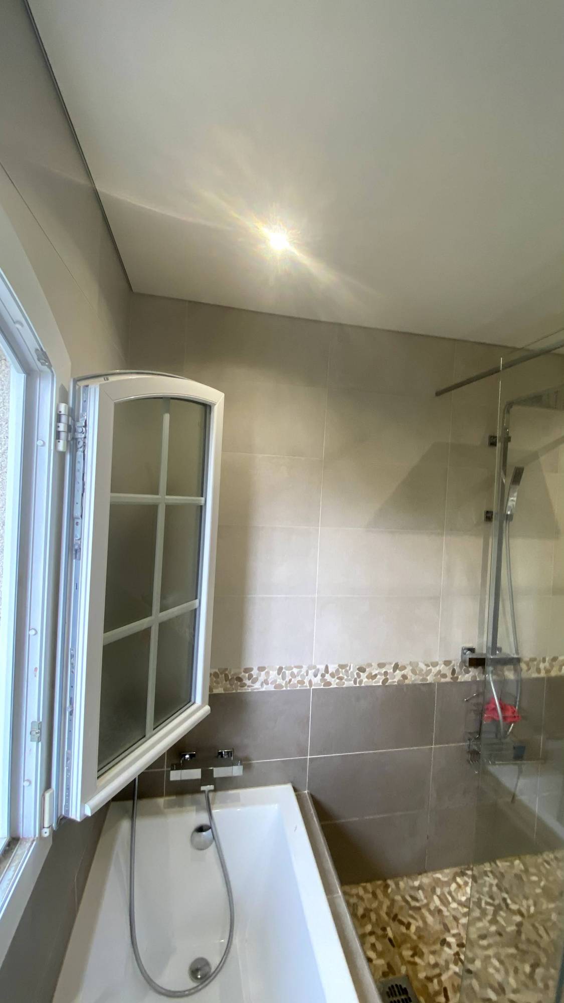 C'est pourquoi, après nous avoir consultés et eu connaissance des nombreux avantages du plafond tendu BARRISOL, ils nous ont sollicités pour la pose d'une toile tendue pour leur salle de bains (et cuisine). L'aspect blanc mat choisi pour ces 2 pièces rénove parfaitement leur intérieur tout en gardant un côté sobre et traditionnel, comme le placo plâtre peint.